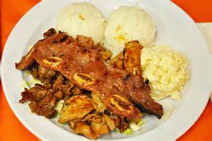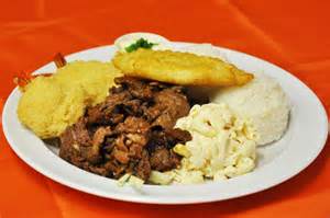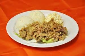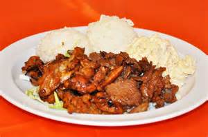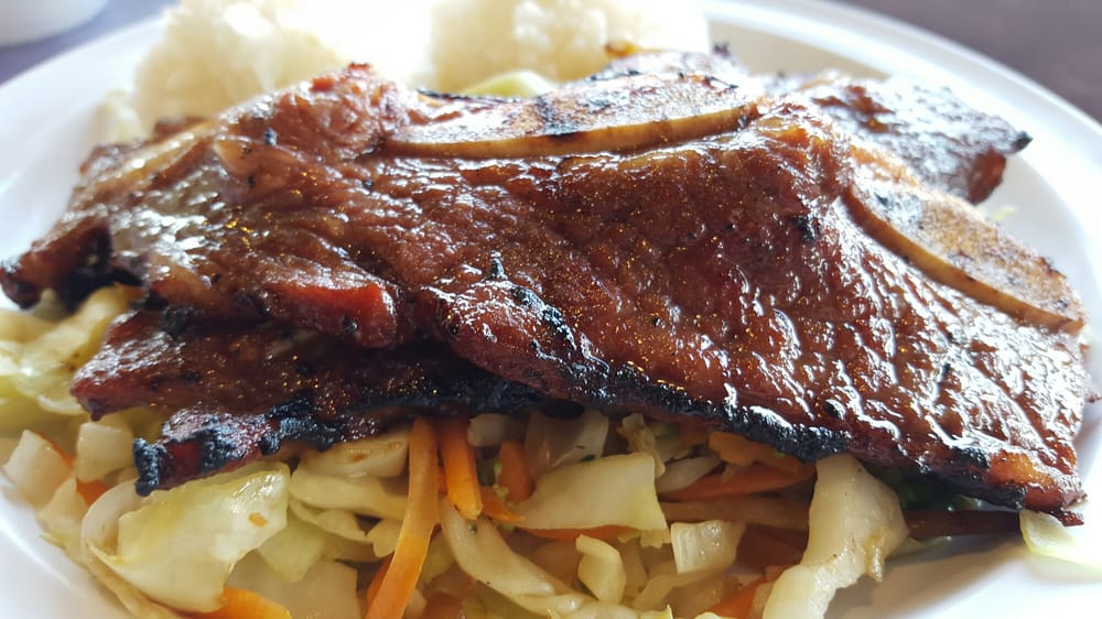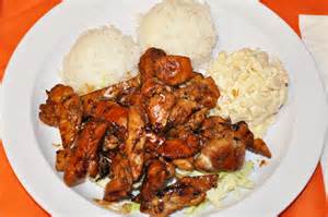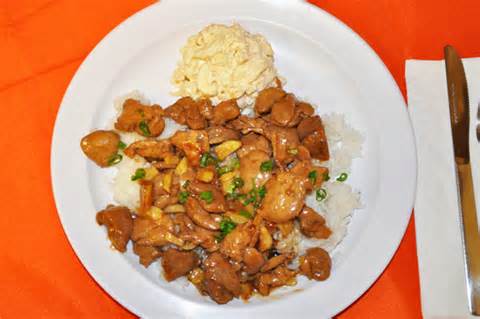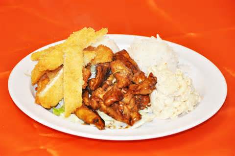 All entrees come with two scoops of steamed rice and one scoop of macaroni salad or stir fry veggies.